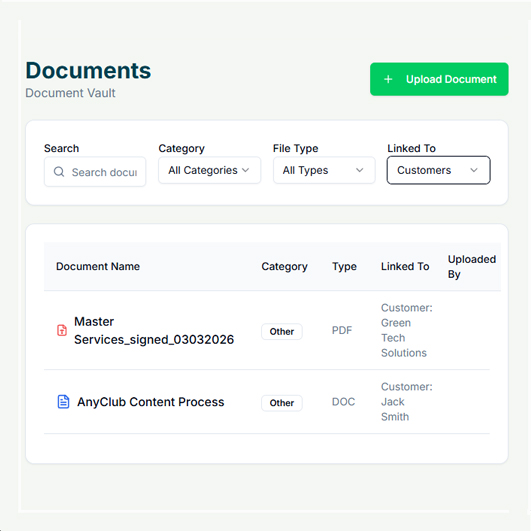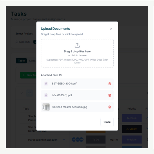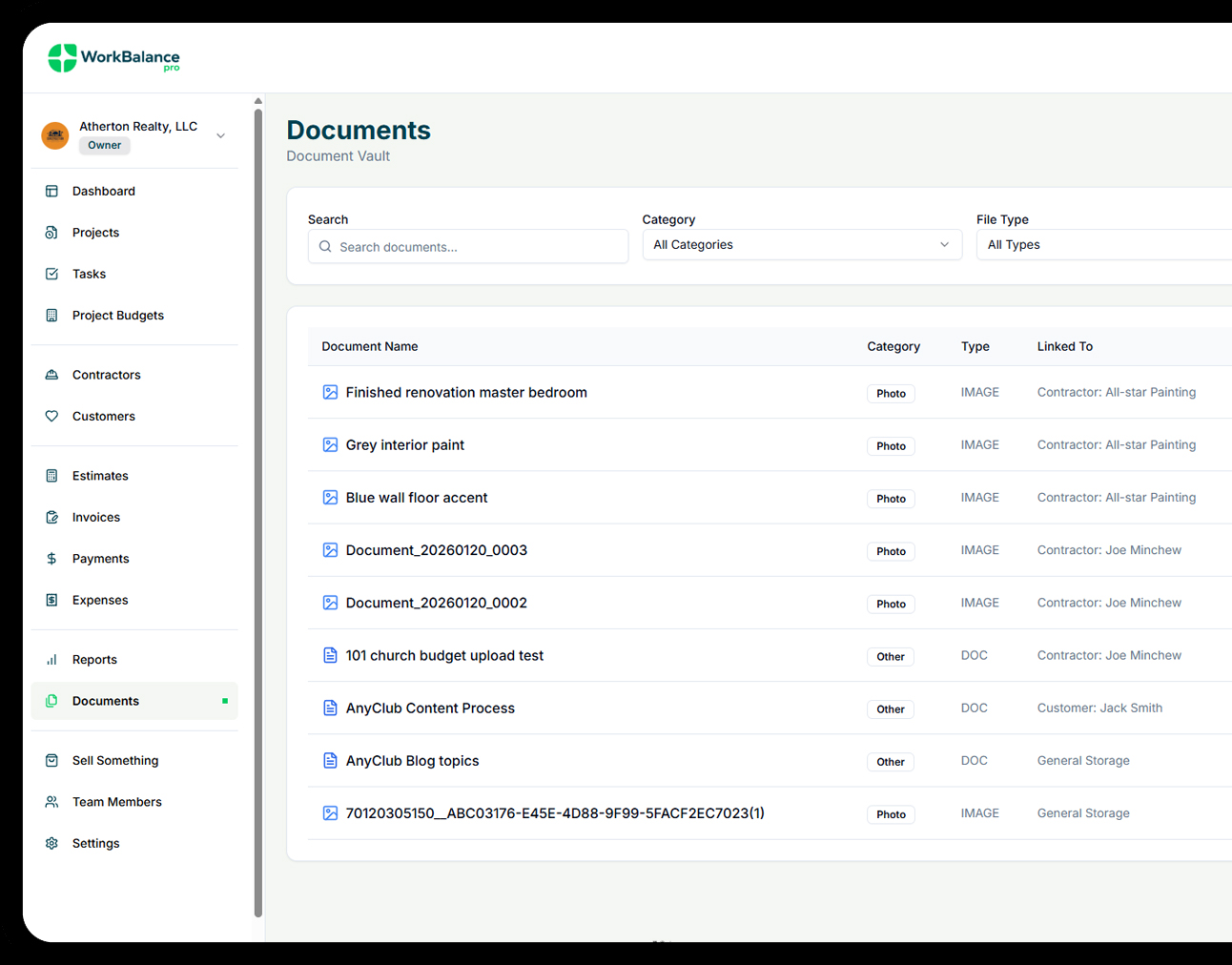 You can upload contracts, receipts, photos, permits, invoices, spreadsheets, PDFs, and other business files. Documents stay securely connected to projects and records.