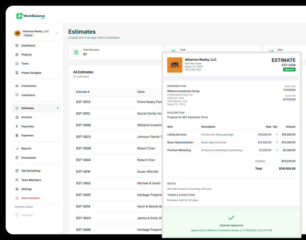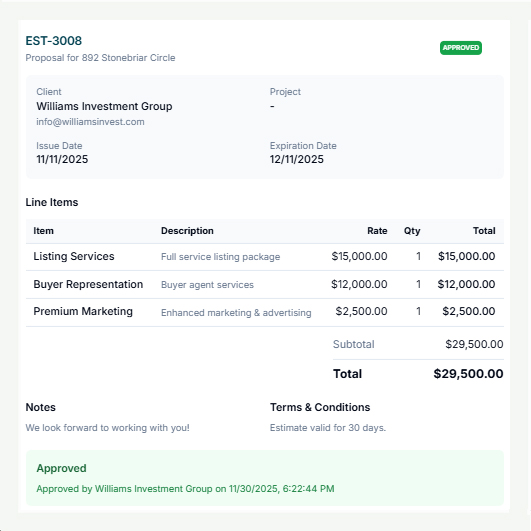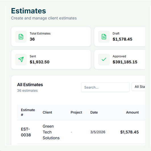 Clients can review estimates through a secure email or shared link. Once approved, the system records the approval status and keeps it tied to the project history.