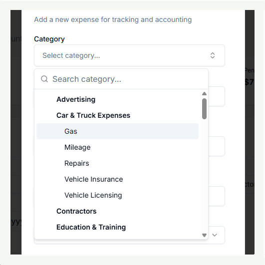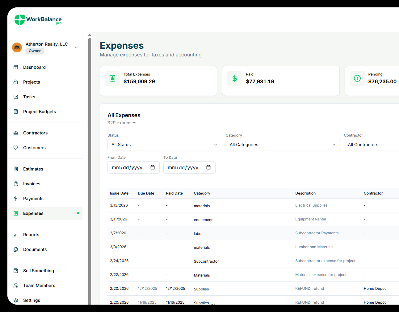You can organize expenses using accounting categories such as materials, subcontractors, travel, equipment, or overhead. Categories help power financial reports and tax summaries.