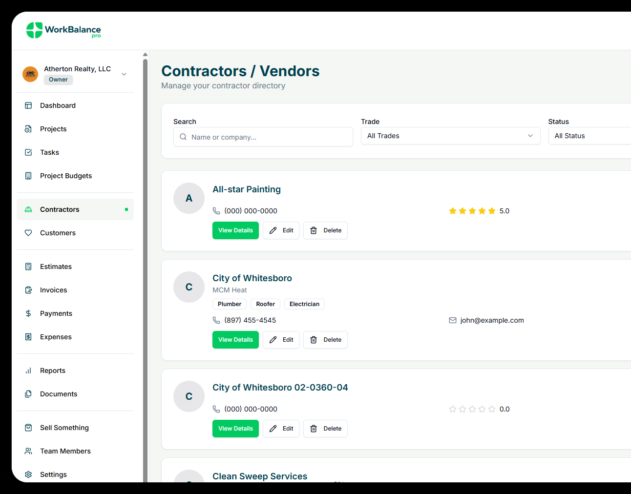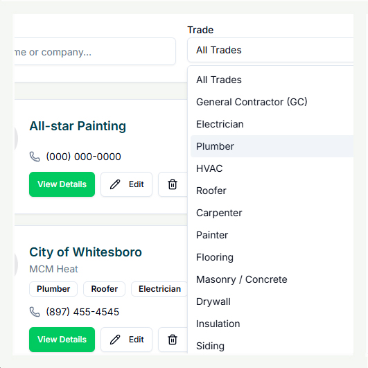 You can store contact details, trade categories, ratings, notes, assigned projects, payment history, and important compliance documents such as licenses or insurance certificates.