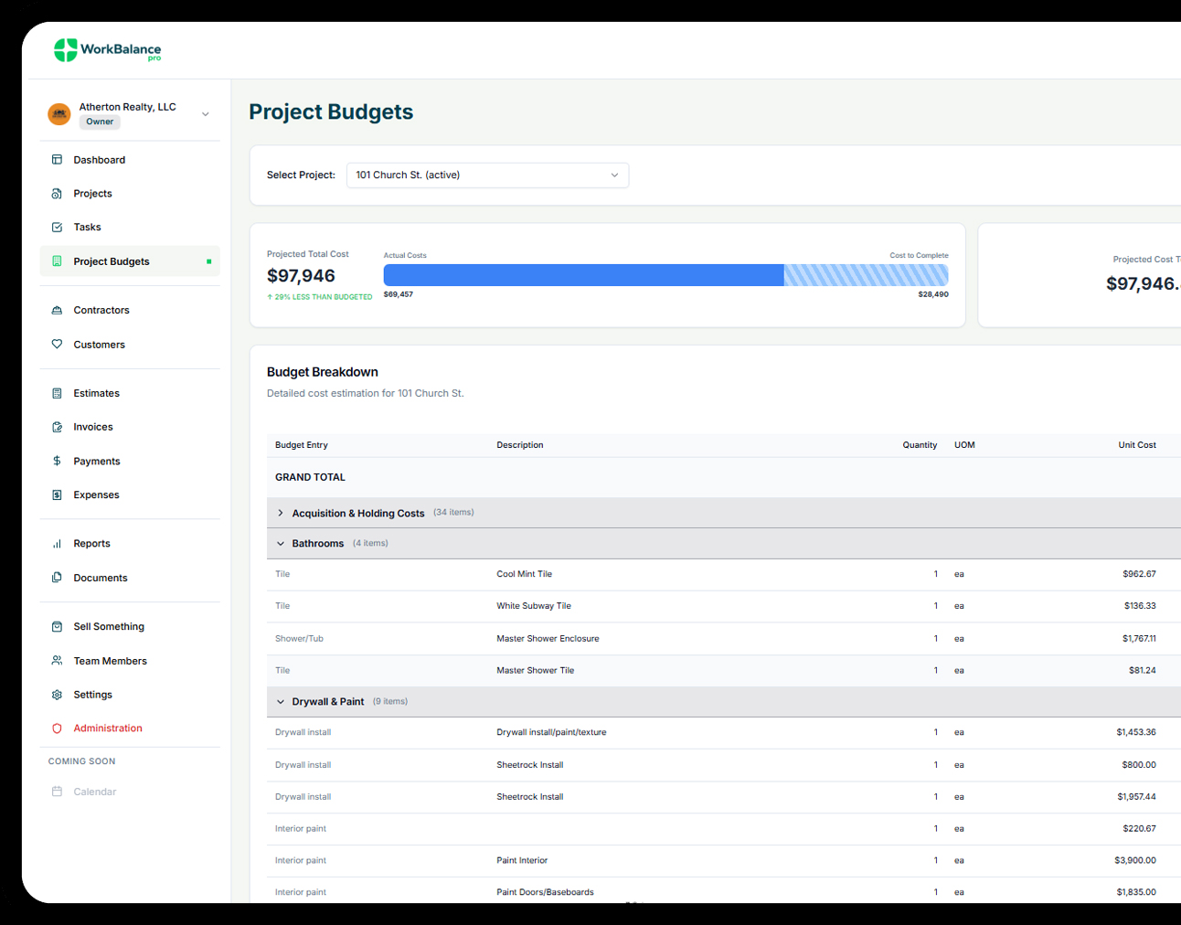 Create detailed budgets directly from approved estimates or build them from scratch using flexible cost categories and line items. Organize labor, materials, vendors, and overhead so your financial plan reflects real project conditions.