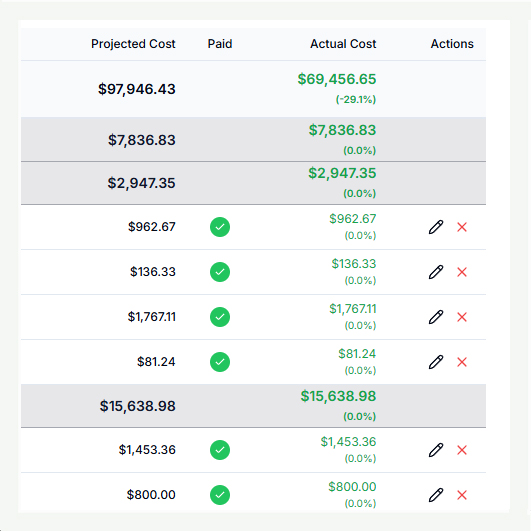 Expenses, invoices, payments, and change orders update the budget automatically so you can compare planned costs against real spending at any time.